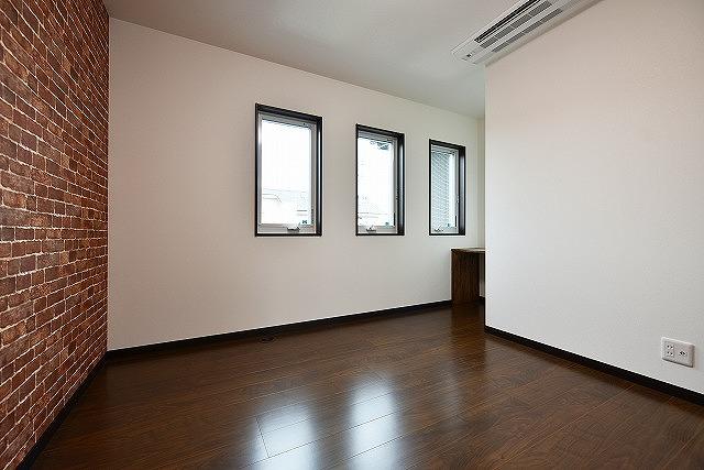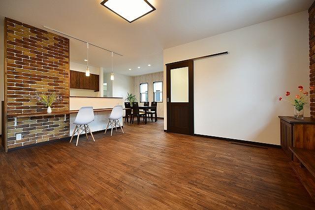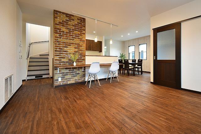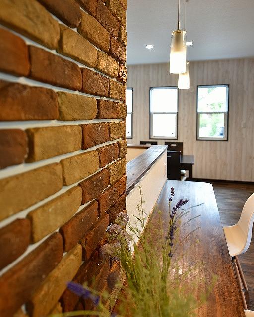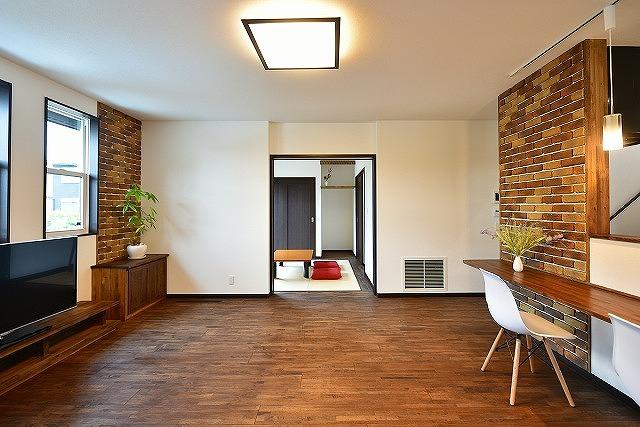 ◩ 3 ◩ リビングはブリックタイルのアクセントウォールでお洒落に演出