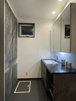 ①洗面脱衣室、ランドリールーム、クローゼットを横並びに配置。洗う・干す・しまうがスムーズな動線に。