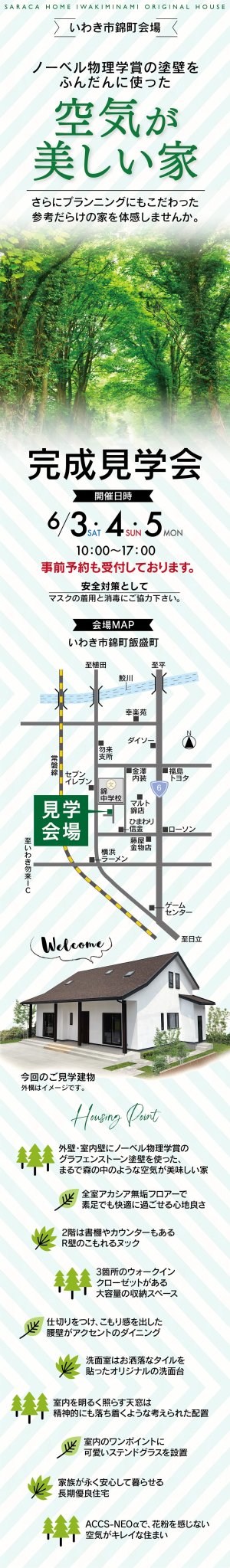 6/3(土)・4(日)・5(月)の3日間、いわき市錦町で、空気が美味しい家の完成見学会を開催致します。