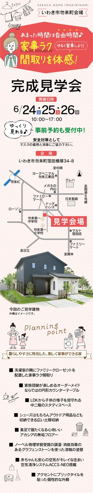 6/24(土)25(日)26(月)の3日間、いわき市勿来町で、あまった時間は自由時間♪家事ラク間取りを体感できる完成見学会を開催致します。
