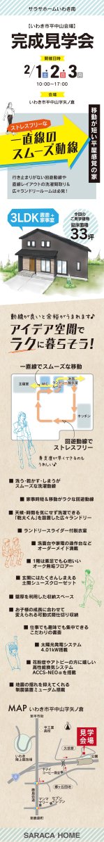 いわき市平中山で、ストレスフリーな一直線のスムーズ動線の家の完成見学会を開催致します。