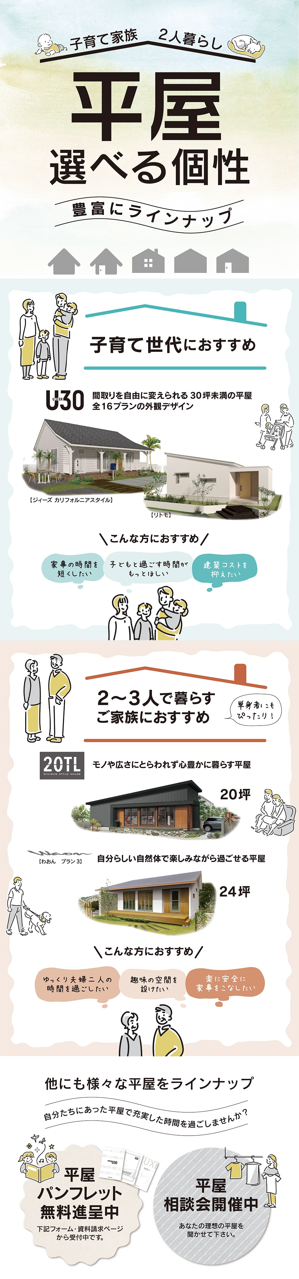 サラサホームではお客様の暮らし方に合わせた平屋を、個性豊かにラインナップ。子育て世代のご家族も、2〜3人で暮らすご家族にもぴったりのプランを多数ご用意しております。 自分たちにあった住まいで充実した時間を過ごしませんか? こだわりの家づくりをお考えの方、ご興味のある方、まずはお気軽にお問い合わせ下さい。 建てたい平屋のプランニングと資金計画を無料で致します。